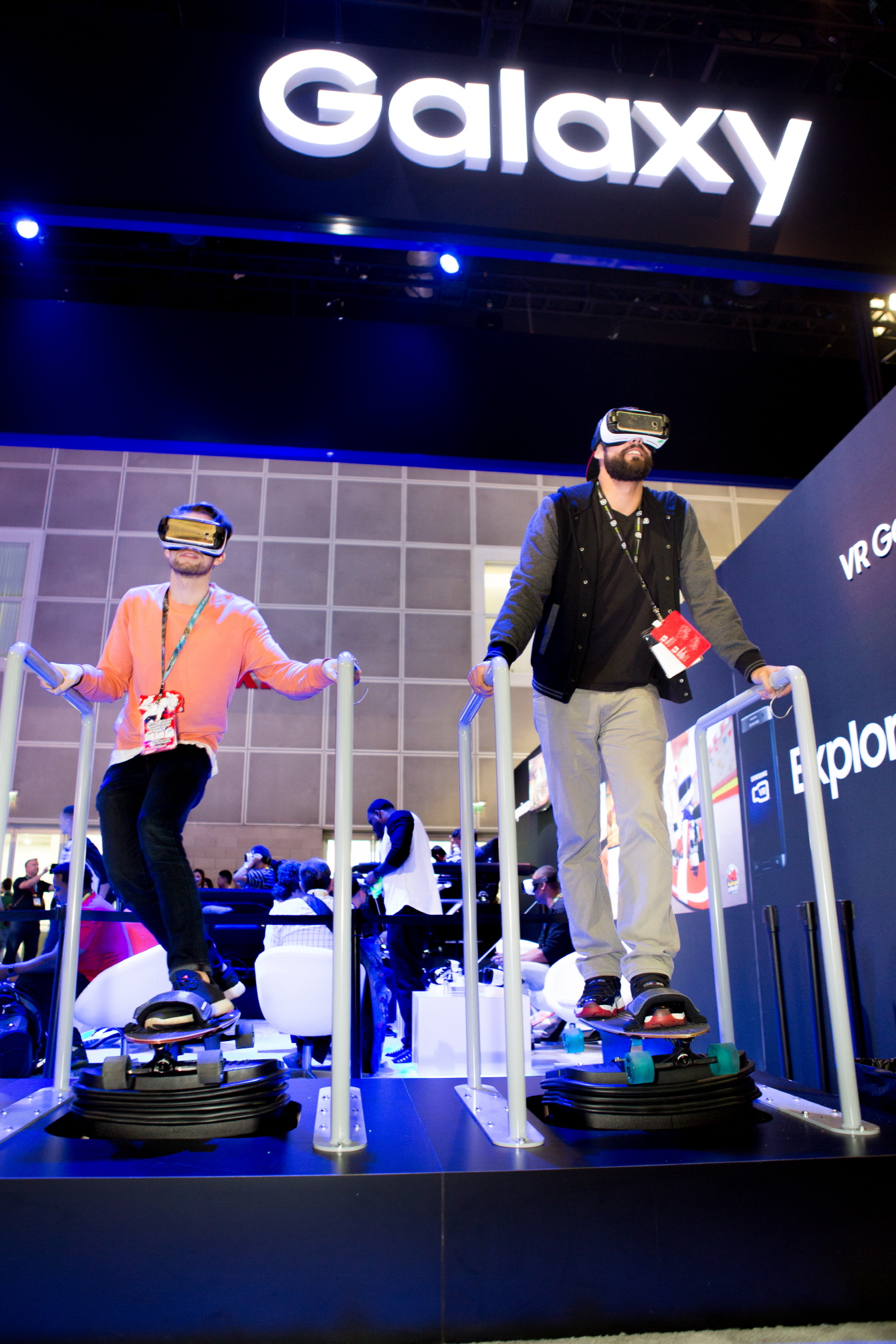 <사진 / 뉴스비전e> [뉴스비전e 김호성 기자] 삼성전자가 16일(현지시간)까지 미국 로스엔젤레스 컨벤션 센터에서 개최되는 세계 최대 게임 박람회 E3 2016에 참가했다고 15일 밝혔다. <사진 / 뉴스비전e> 미국 로스엔젤레스 컨벤션 센터에서 개최 중인 세계 최대 게임 엑스포 E3 2016에서 관람객들이 삼성전자 ‘갤럭시 S7’과 ‘기어 VR’을 통해 4D 스케이트 보드를 즐기고 있다. <사진 / 뉴스비전e>