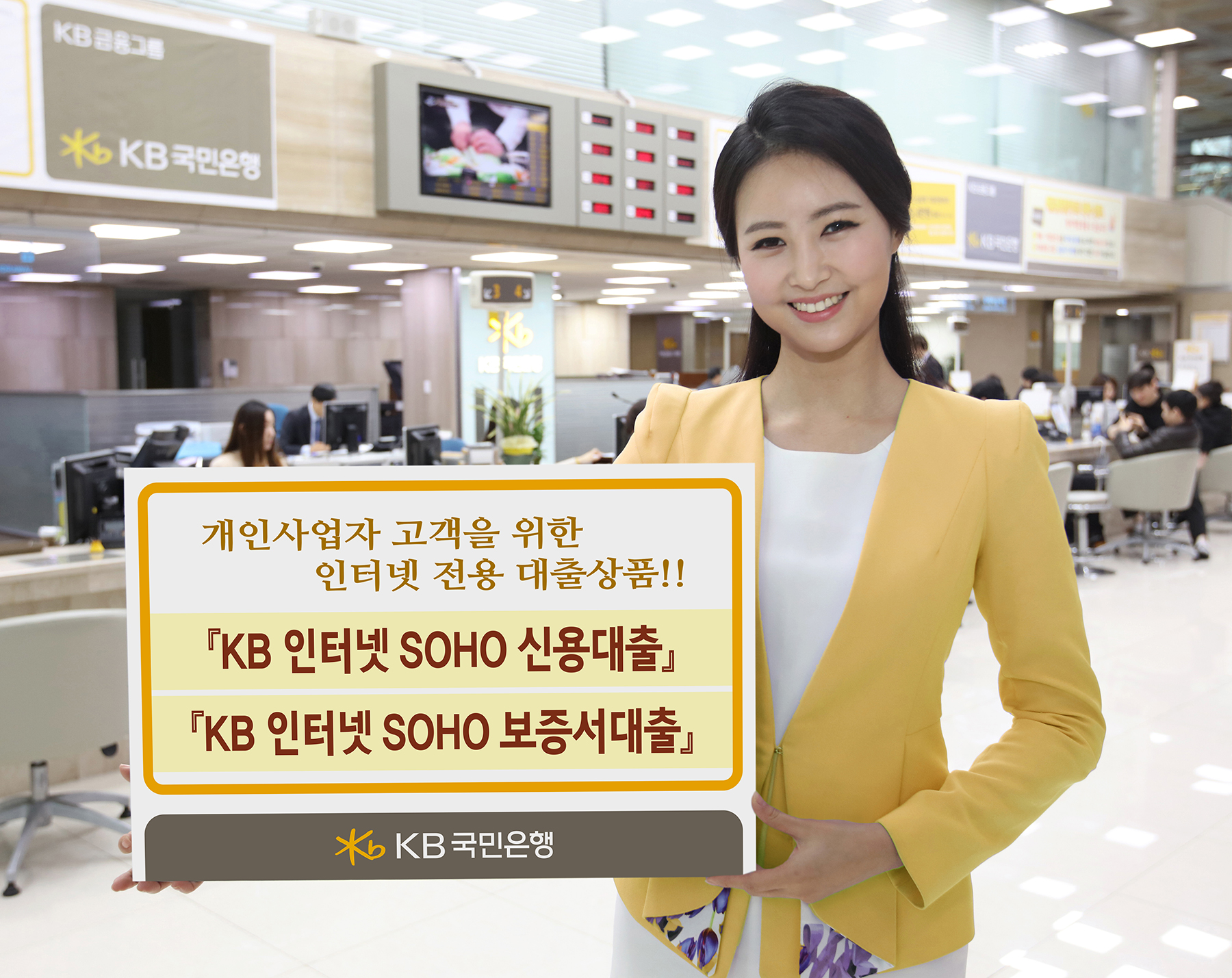 ‘KB 인터넷 SOHO 보증서대출’은 신용보증재단중앙회와의 협약을 통해 「플러스 모바일 보증서」를 발급 받은 개인사업자가 대상이며, 대출 한도는 최대 2천만원, 금리는 4.02%~4.52%(신용등급 4등급 기준) 수준이다.