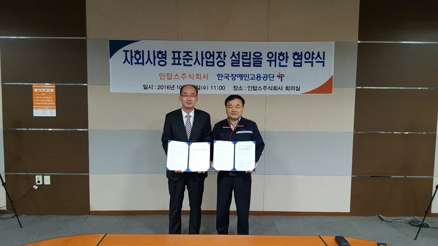 인탑스 구미사업장 대회의실에서 26일 진행된 협약식에는 인탑스 정사진 대표, 조광현 경영지원그룹장, 한국장애인고용공단 홍두표 경북지사장, 염규문 기업지원부장, 김창곤 고용창출부장이 참석하였으며, 자회사형 표준사업장 설립을 통하여 장애인 일자리 창출 및 전방위적인 지원에 적극적으로 동참할 것을 협약하였다.