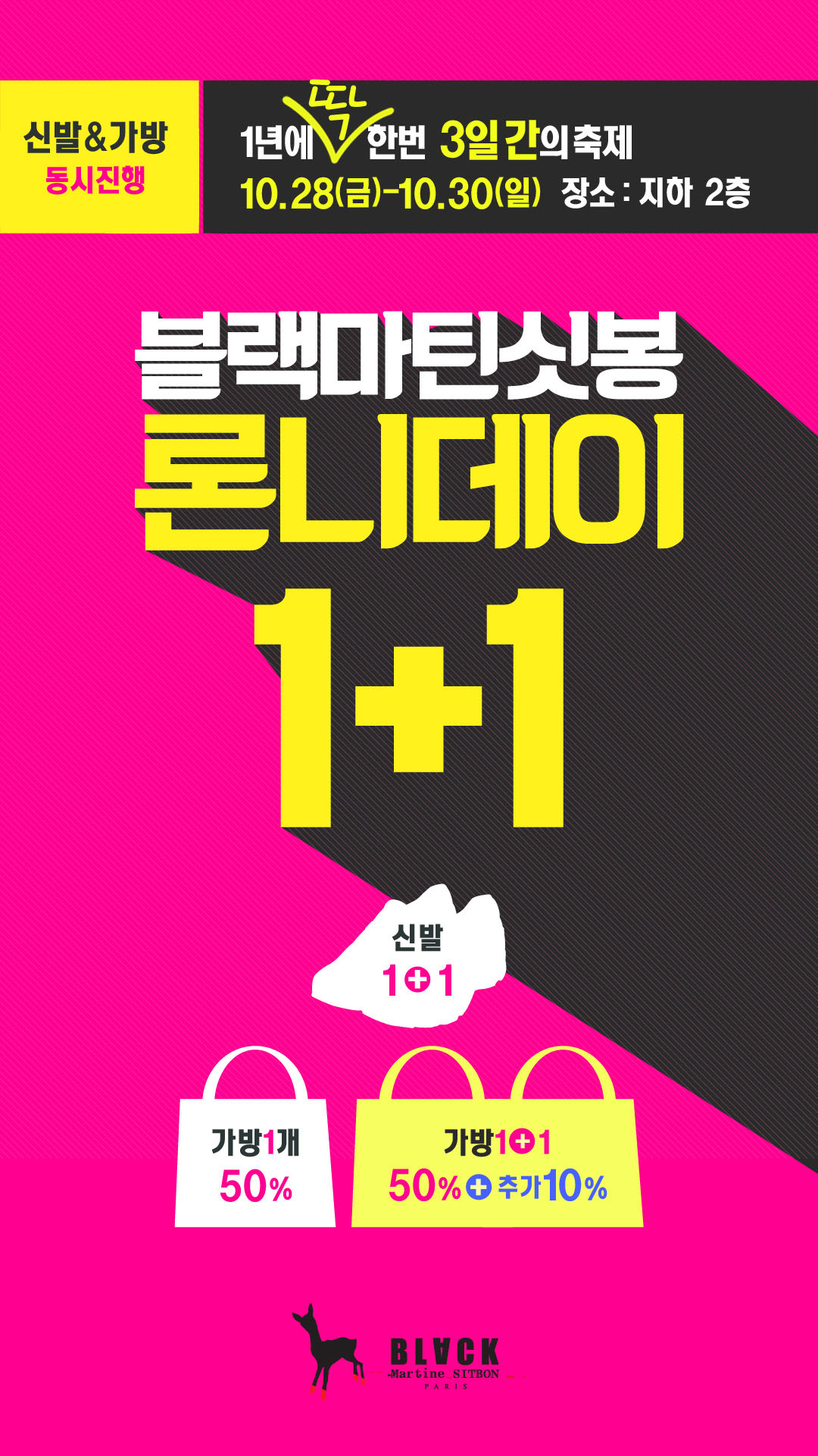 프랑스 브랜드 ‘블랙마틴싯봉’은 오늘부터 30일까지 타임스퀘어 지하 2층 주마(ZUMA) 매장 앞에 마련된 특설 행사장에서 1년에 단 한번 실시하는 ‘론니데이’ 이벤트를 진행한다. 단 3일간 슈즈 1켤레 구매 고객에게 1켤레를 추가 증정하는 1+1 프로모션을 비롯해 가방 1개 구매 시 50% 할인, 가방 2개 구매 시 추가 10% 할인을 제공하며 통 큰 프로모션을 선보인다.