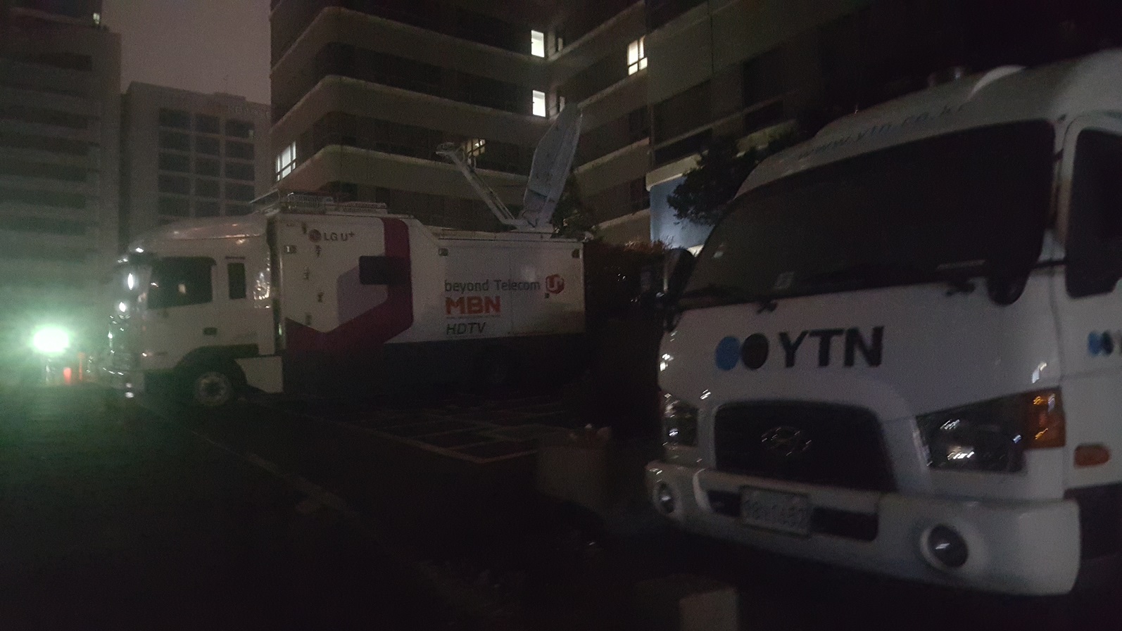 강남구 대치빌딩 주변 특검 사무실 주차장에 방송국 중계차들이 모여있다.